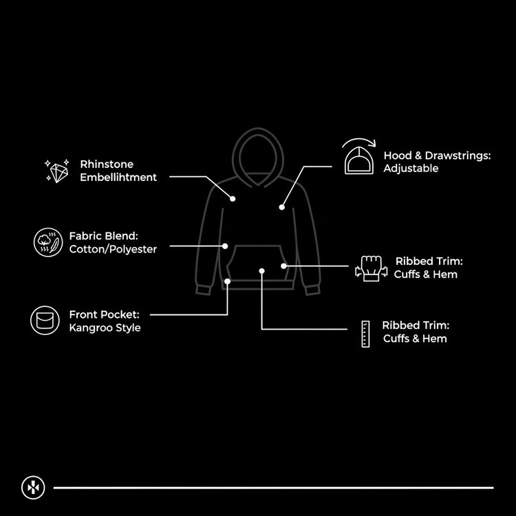 Featuring sparkling rhinestones, a soft brushed fleece lining, stretchy ribbed cuffs, and an adjustable hood, this hoodie blends style and comfort perfectly.